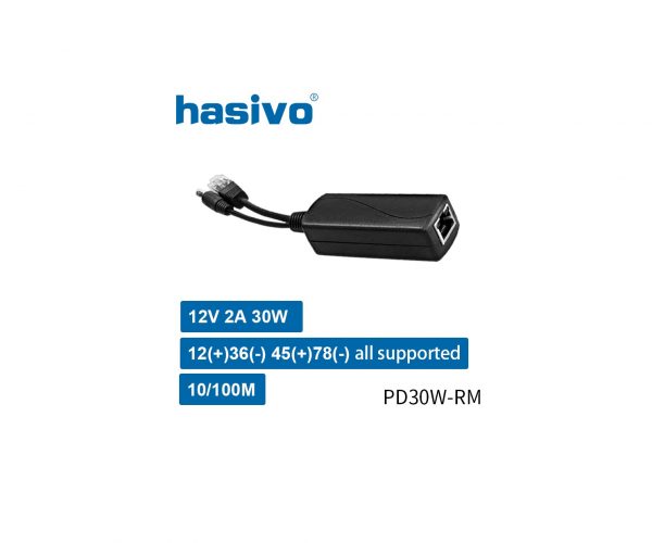 Bộ tách nguồn PoE Splitter Hasivo PD30W-RM được sử dụng chủ yếu với Switch PoE hoặc PoE Injector, tách dữ liệu và cung cấp nguồn điện ra 12VDC, 2A tối đa 30W để cung cấp tới các Camera IP, thiết bị Wifi AP không hỗ trợ tính năng nhận PoE và hoạt động với điện áp DC12V. Adapter tách nguồn PoE PD30W-RM hỗ trợ cổng dữ liệu RJ45, tốc độ kết nối 10/100Mbps, phù hợp với yêu cầu trao đổi dữ liệu lớn giữa camera và hạ tầng mạng Ethernet PoE.